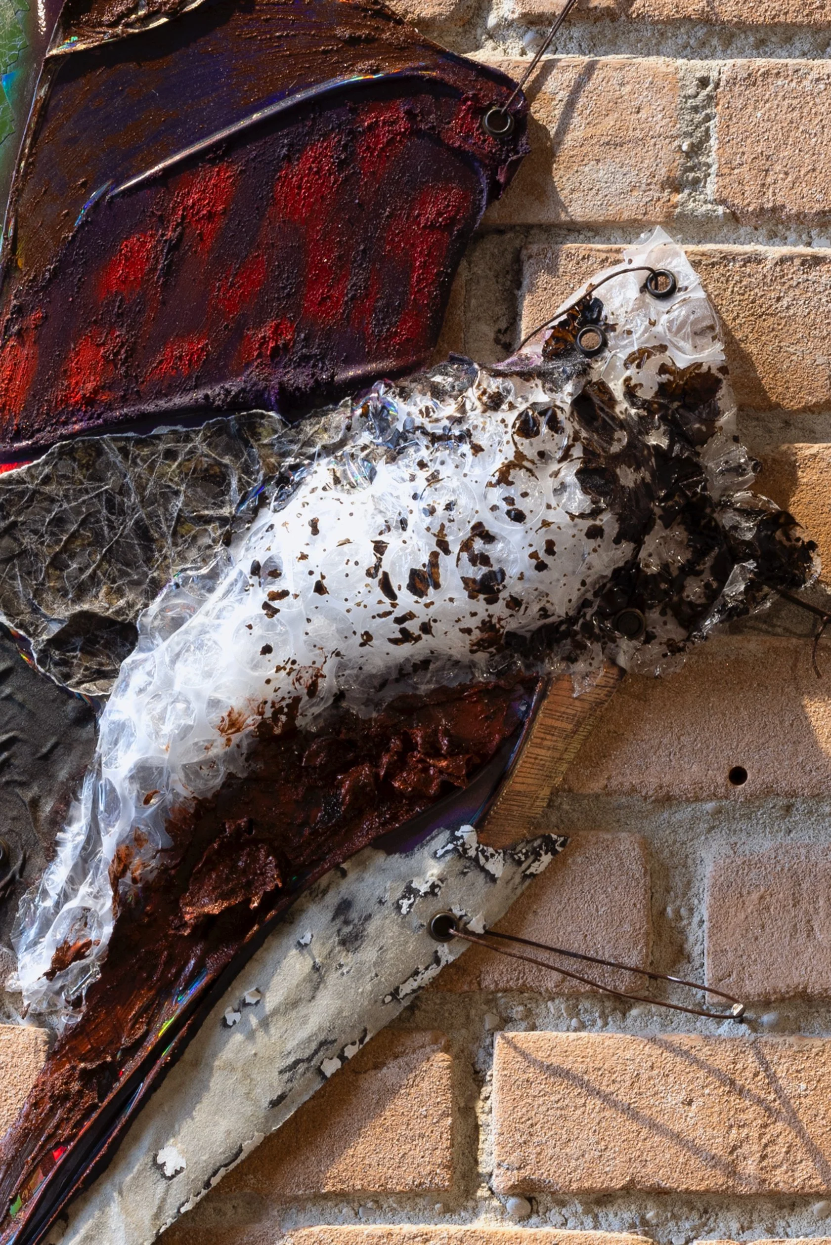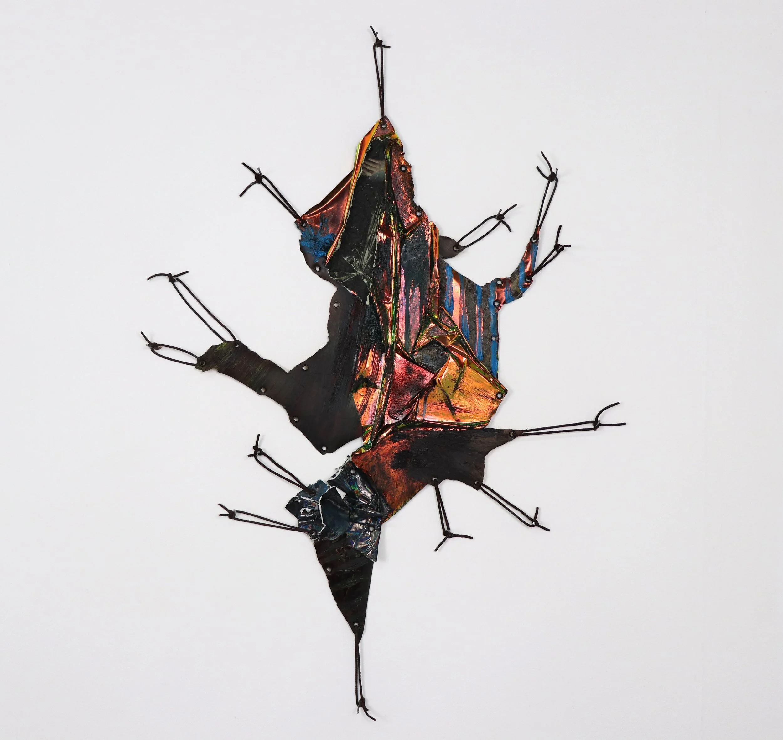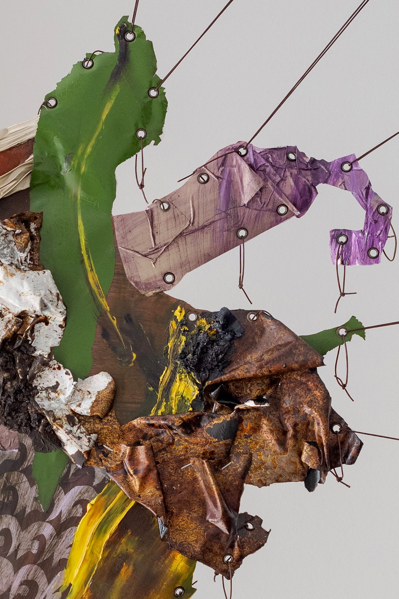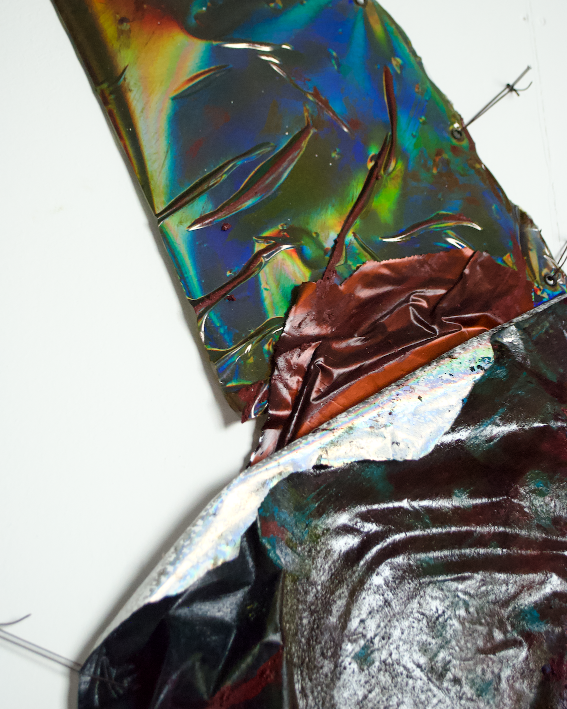 oil paint, acrylic paint, bitumen, paper on on car wrap, leather, nails
