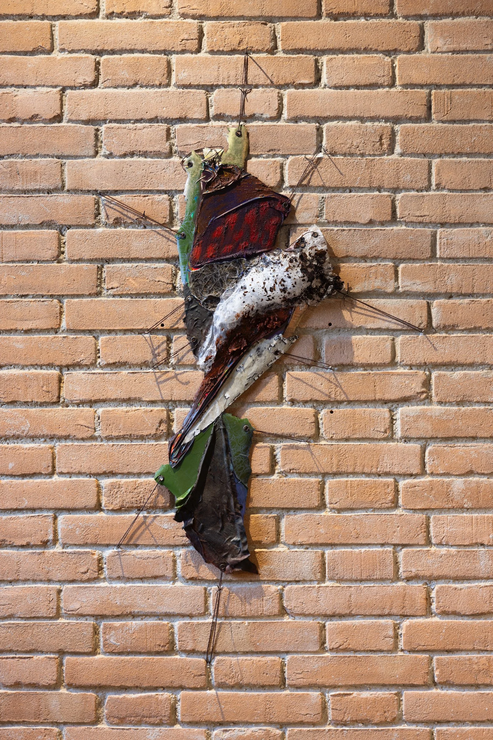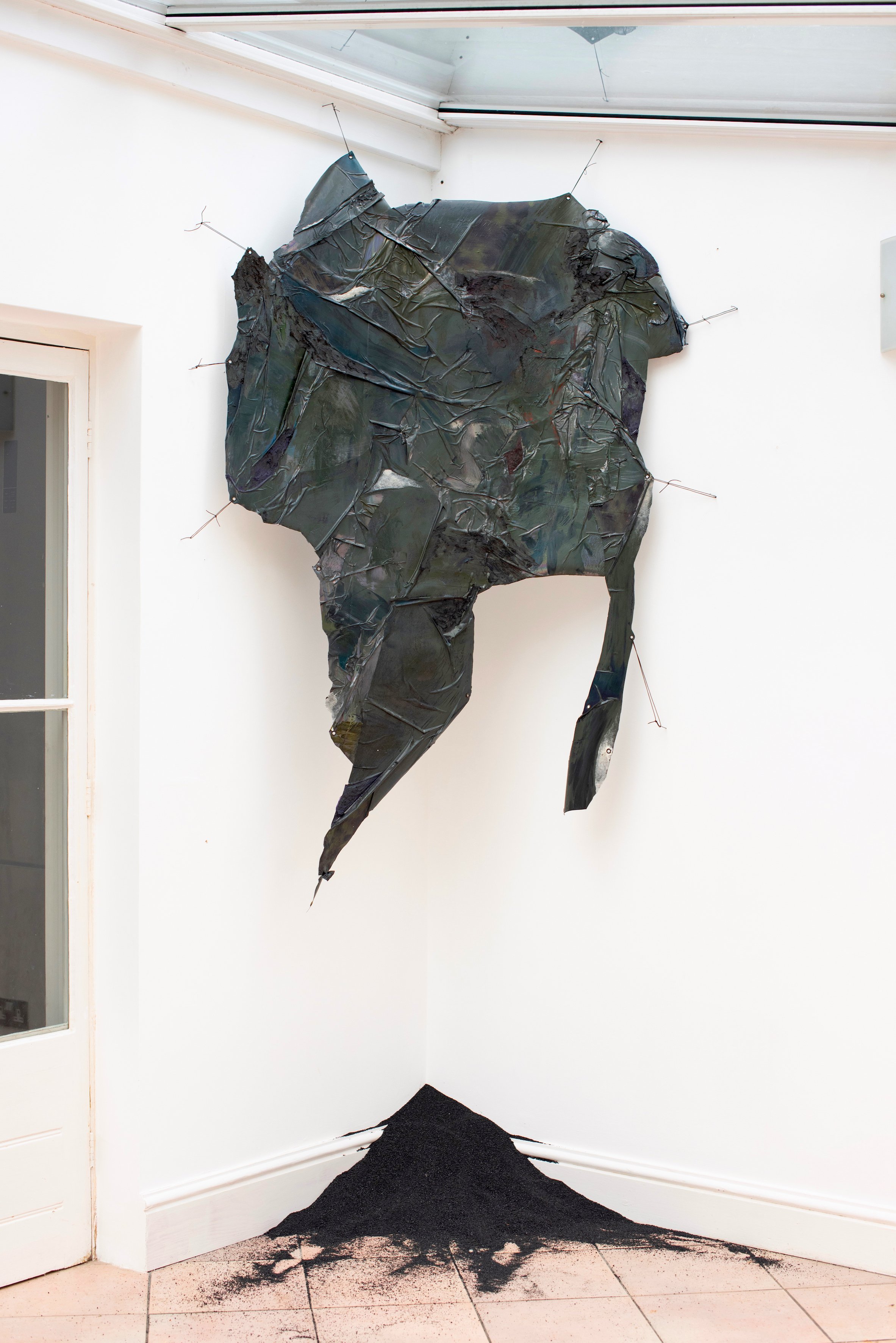 oil paint, bitumen and wax on car wrap, leather, nails, slag